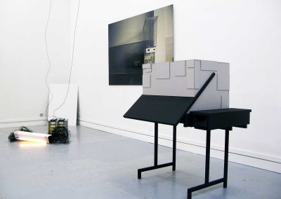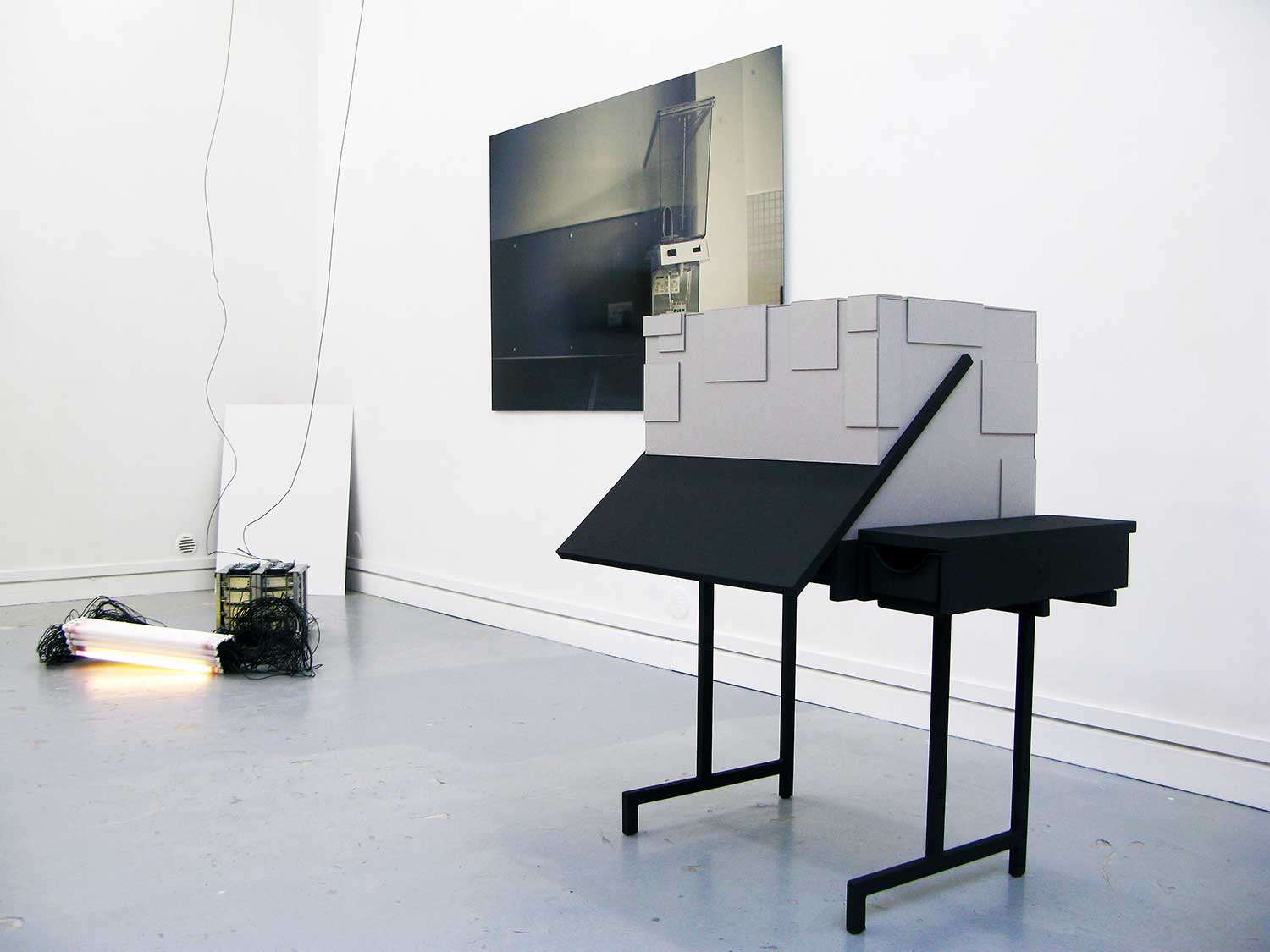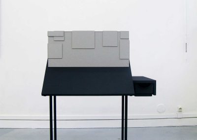 Collision 2010 Exposition collective « Banalités curieuses », galerie Immanence, ParisCommissariat d’exposition « Du Cygne » maquette, carton gris , table à dessin, peinture acrylique noir mat