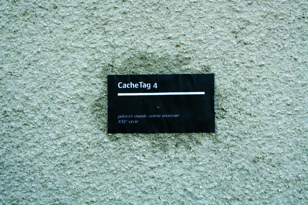 Collage de huit cartels sous une série de  » Cache-tags « .
