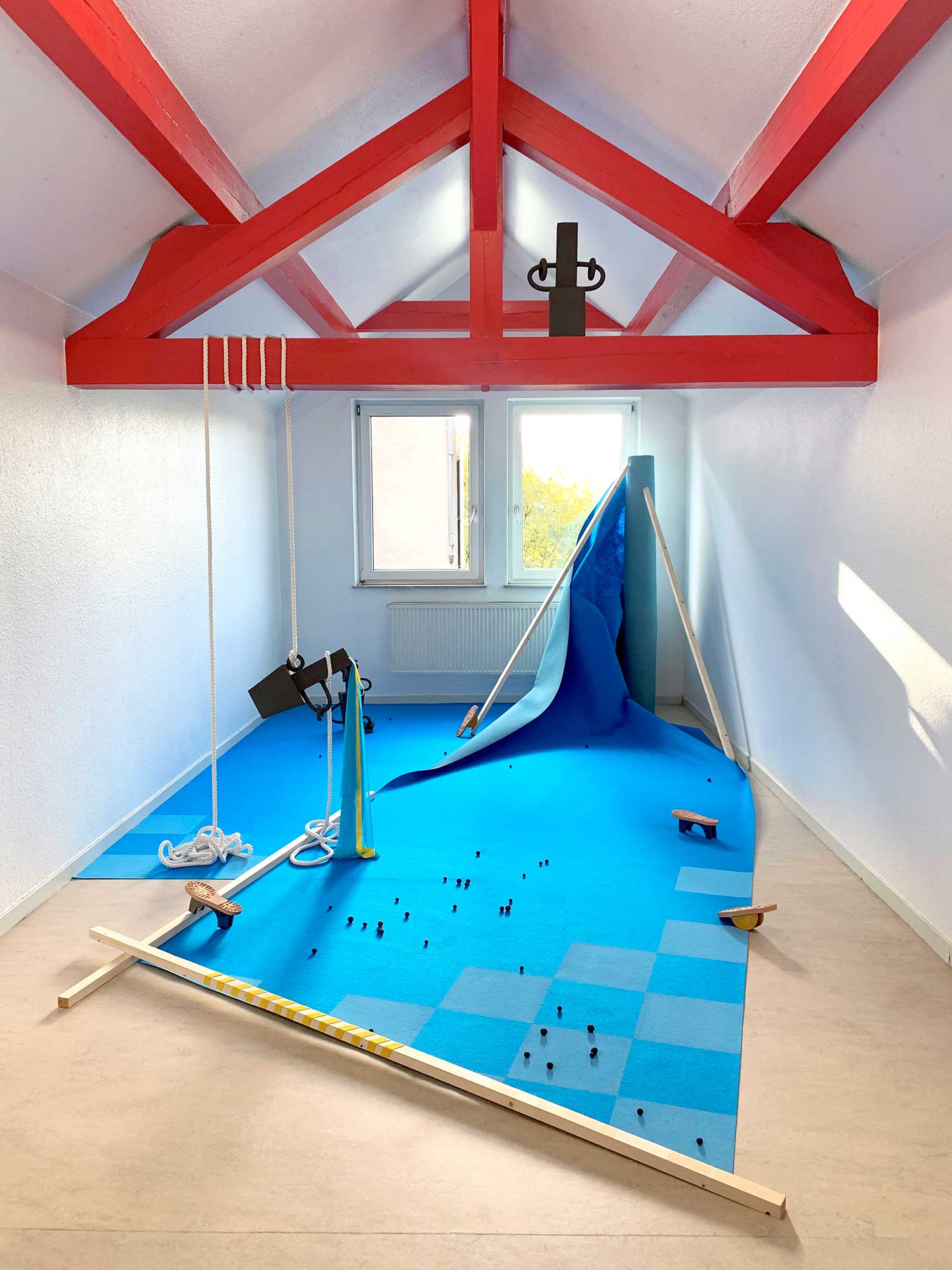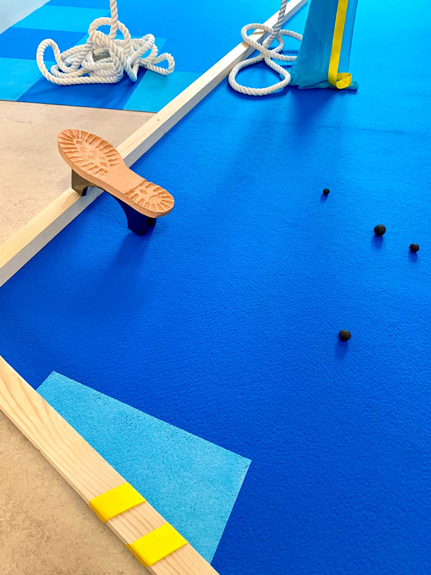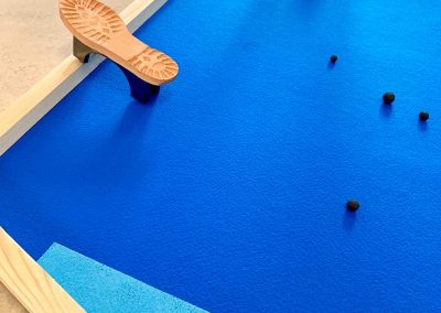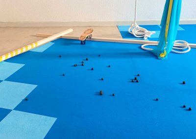 Pour son intervention à Castel coucou, Cécile Meynier s’empare du lieu comme d’un terrain de jeu. « Square » est l’occasion de rejouer des pièces pré-existantes et de les faire dialoguer ensembles en créant un paysage plastique et ludique à partager.