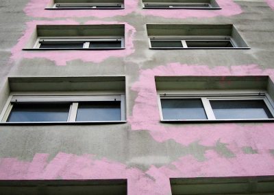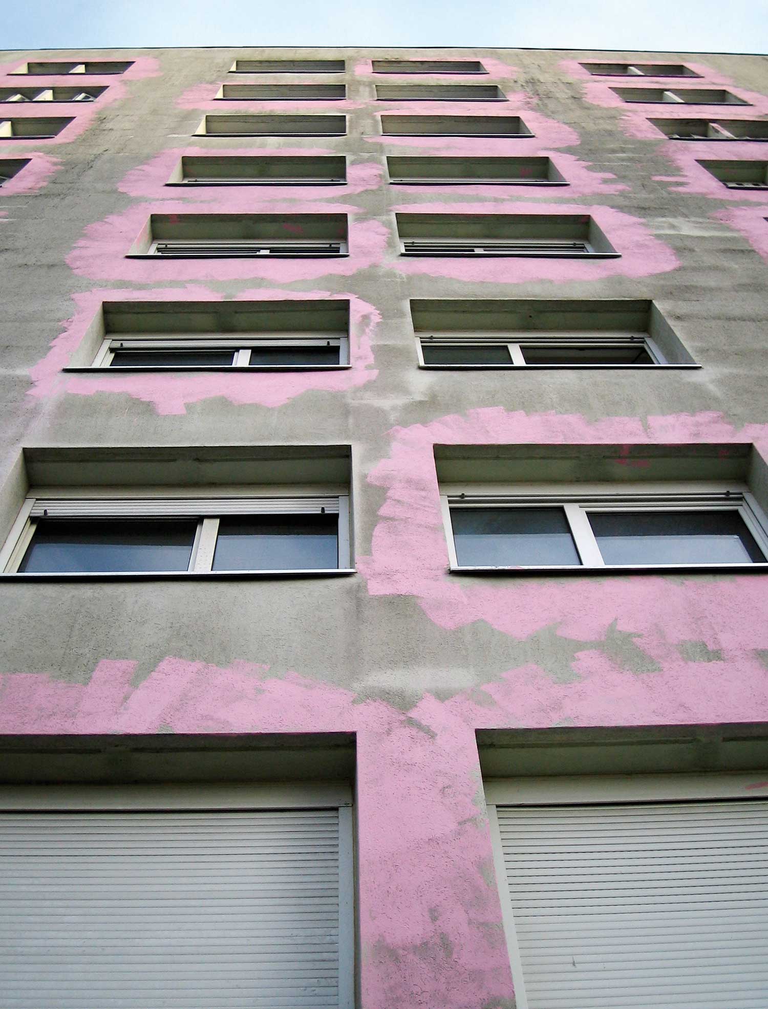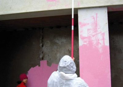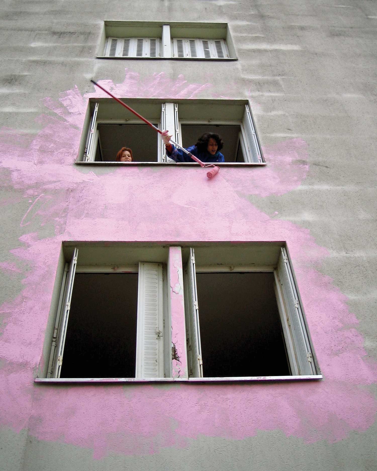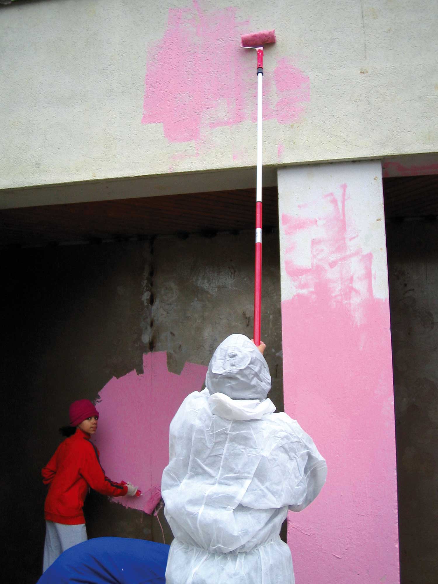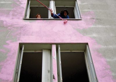 Peindre en rose et au rouleau tout ce qui est à portée de bras avec les habitant.e.s du quartier.